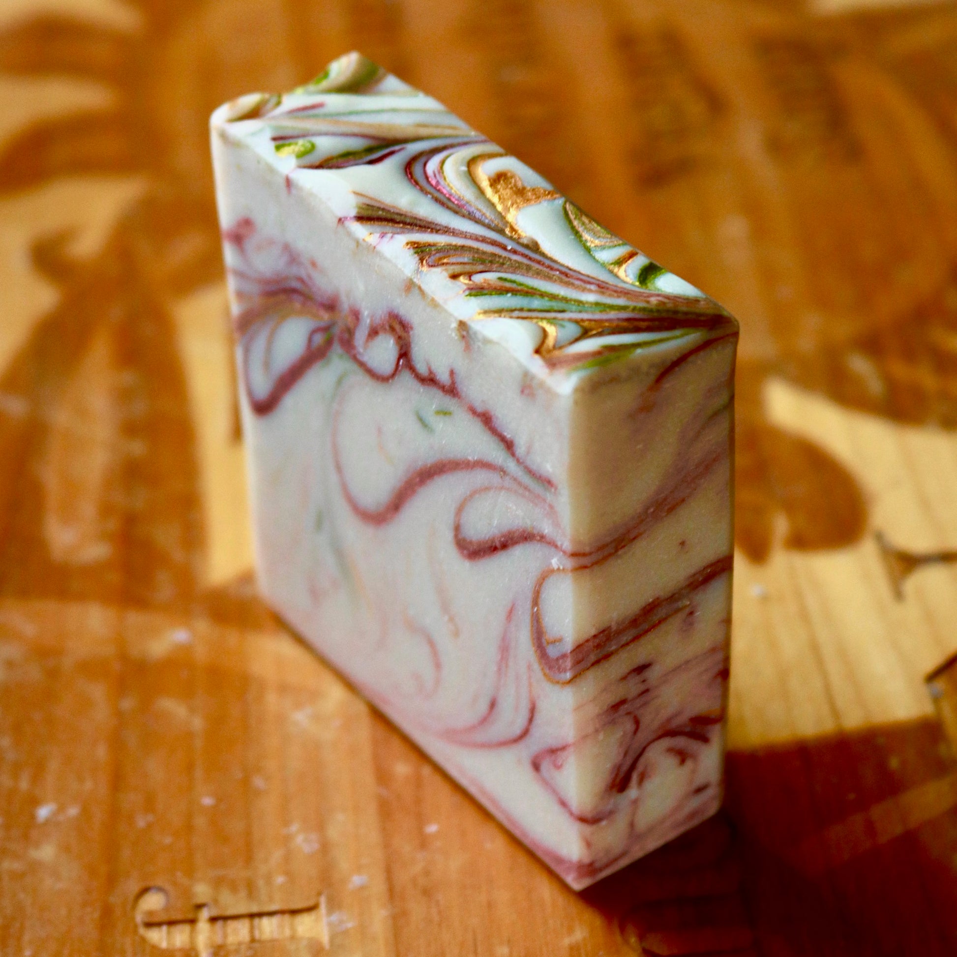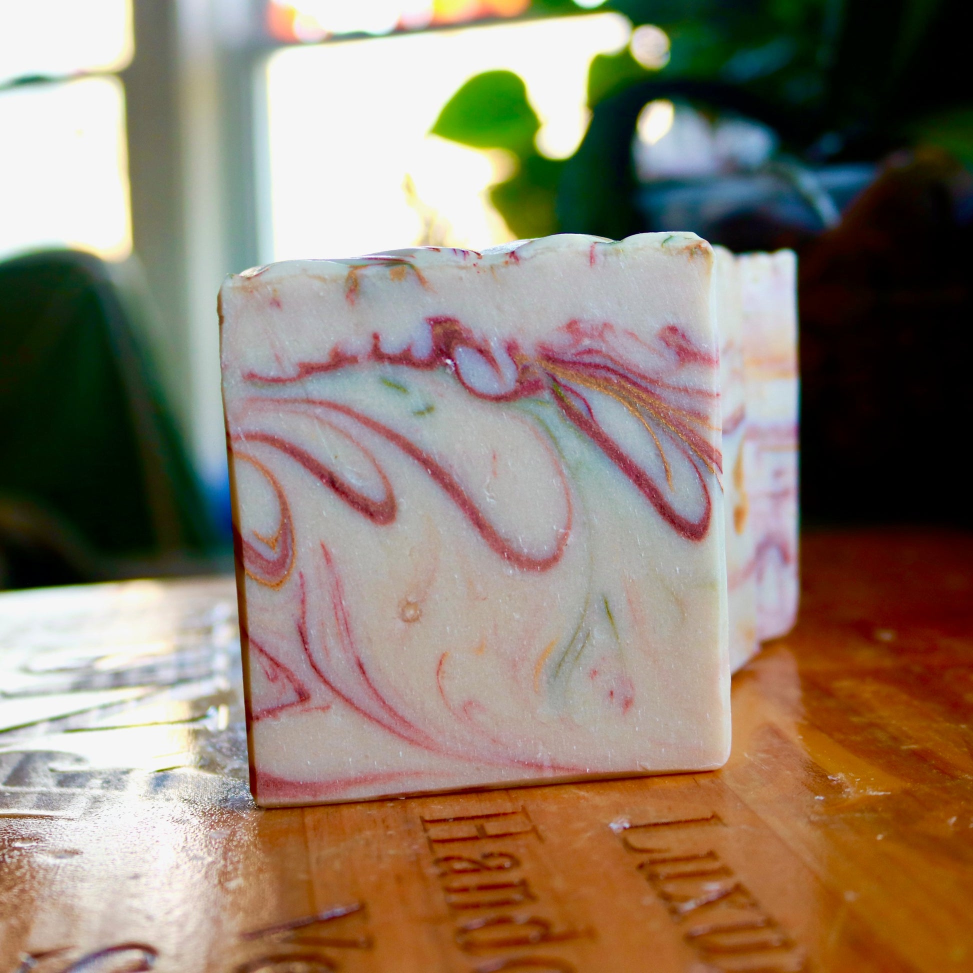 Ingredients: Made in small batches with coconut oil, olive oil, castor oil, sustainable palm oil, lye, filtered water, fragrance and essential oils, cocoa butter, shea butter, kaolin clay, and micas for color.